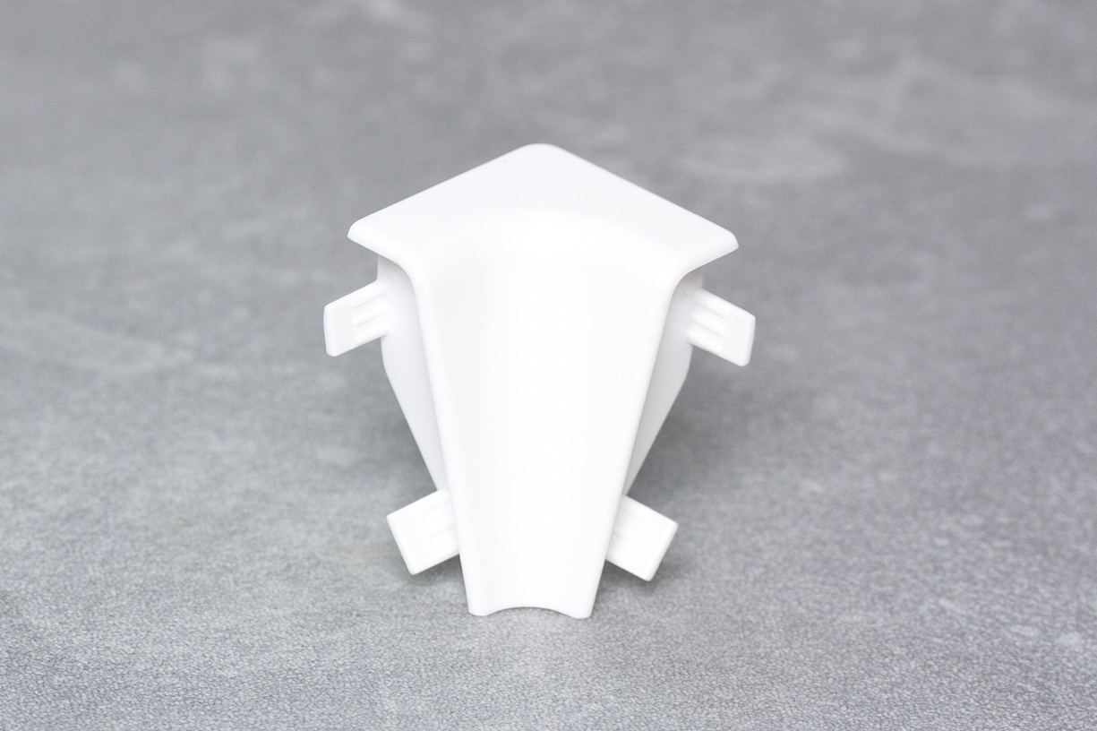 Mit den Zubehörteilen für die Sockelleiste Cube 40 mm lässt sich ein formschöner und harmonischer Übergang und Abschluss zwischen den Fußleisten herstellen. Ein Gehrungsschnitt an Innen- oder Außenecken nicht mehr erforderlich. Die Zubehörteile werden einfach auf die Leiste gesteckt. Das Verlegen von Kabeln hinter der Leiste ist möglich. Die Innen- und Außenecken haben einen Winkel von 90 Grad.