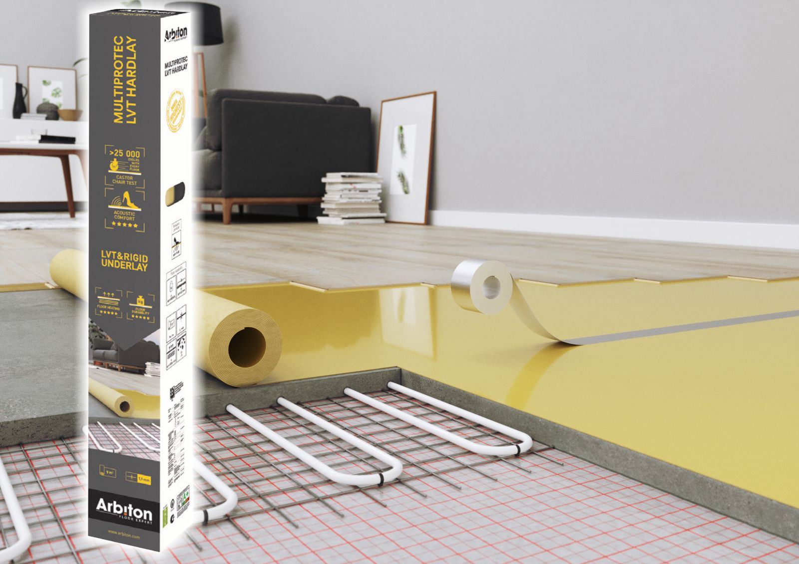 Durch die sehr hoche Druckbeständigkeit ist die Unterlage perfekt geeignet für Räumlichkeiten mit starkem Gehverkehr. Der sehr geringe Wärmewiderstandwert macht Multiprotec Hardlay zur idealen Trittschalldämmung für Bodenbeläge in Verbindung mit Fußbodenheizung.