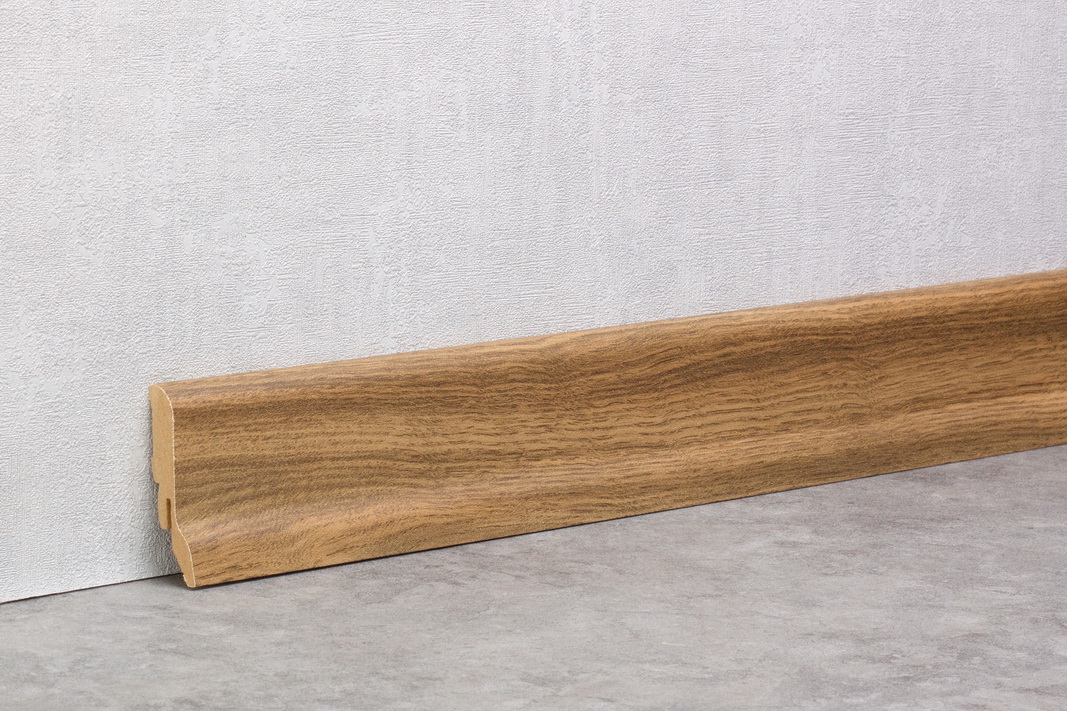 Die Sockelleiste 58mm Classic ist eine strapazierfähige, funktionale Bodenleiste aus dekorummanteltem MDF- Material. Mit der Fußleiste können notwendige Dehnungsfugen bis 20mm Breite zuverlässig abgedeckt werden. Mit den separat erhältlichen Systemclips lässt sich eine verdeckte Montage realisieren. Das Montagesystem ist so konzipiert, dass die Leiste von oben auf die Montageclips gesteckt wird und auf der Rückseite gleichzeitig ein Kanal für die Verlegung von Kabel entsteht. Bei nachträglichen Renovierung oder Malerarbeiten kann die Randleiste problemlos entfernt und erneut wieder montiert werden. Zur Sockelleiste 58mm Classic ist kein weiteres Zubehör lieferbar. In den Ecken sollte diese Bodenleiste auf Gehrung gesägt werden. Als alternative Leiste empfehlen wir die Sockelleiste 58mm Cube oder 60mm Softline.